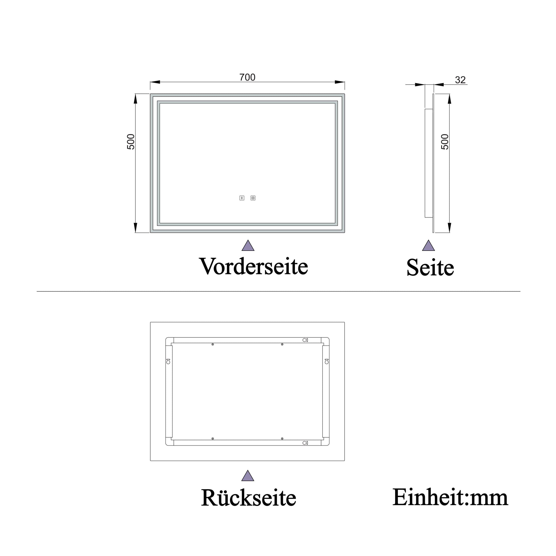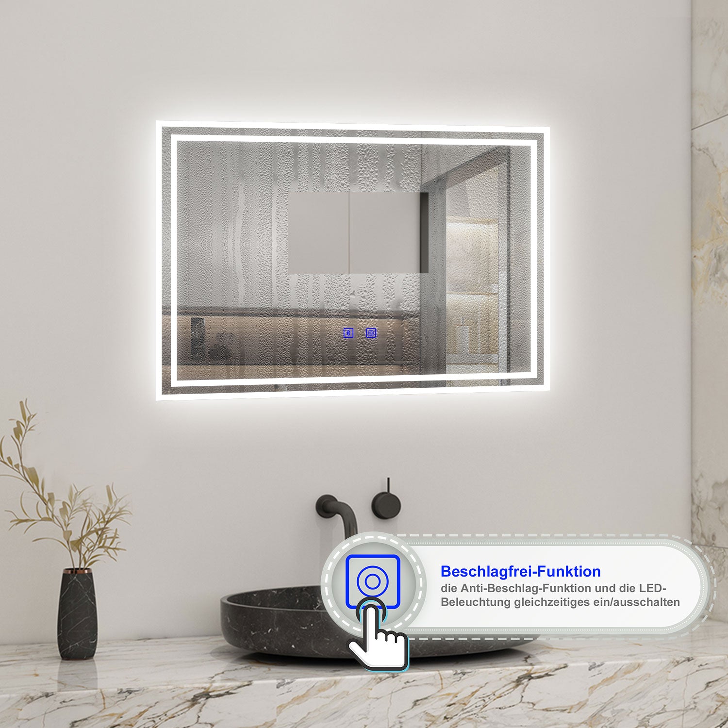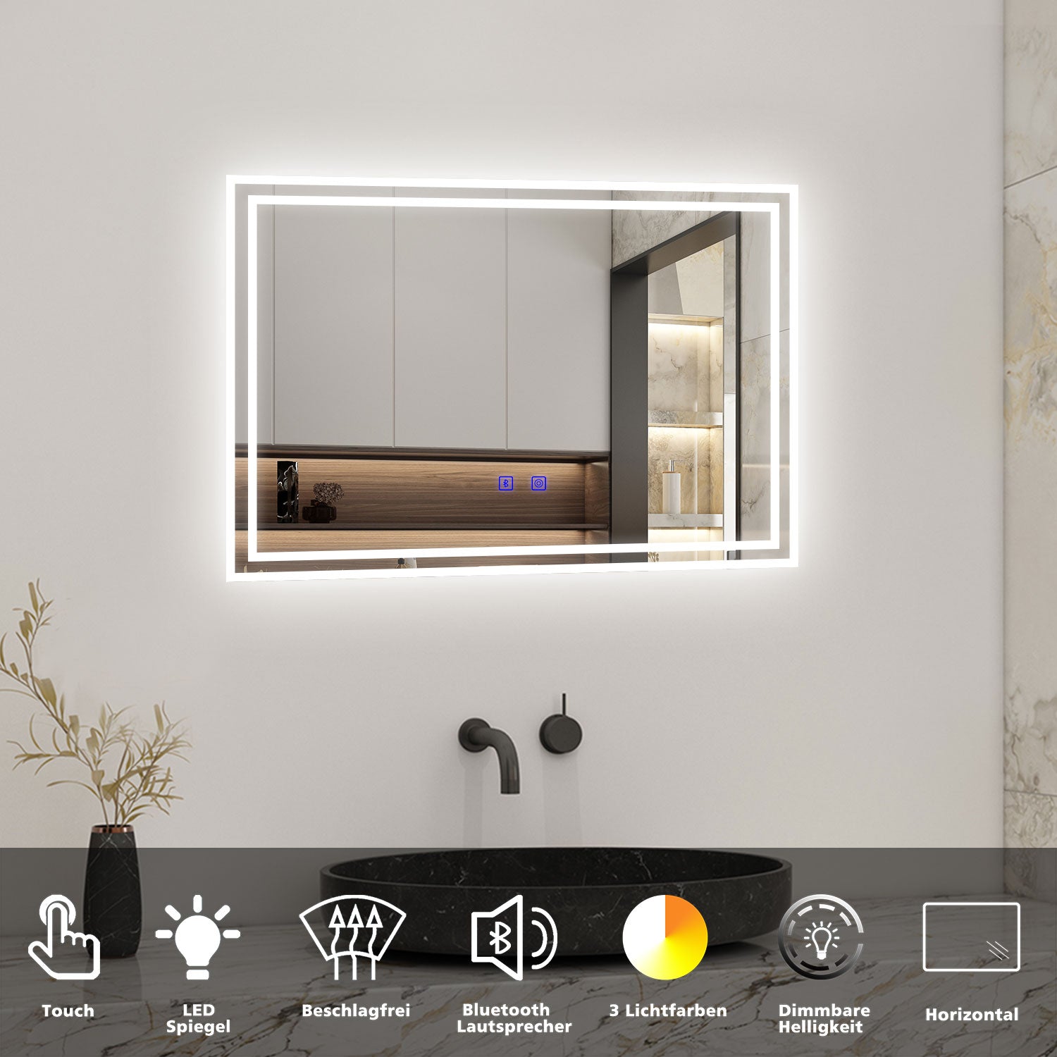 Badspiegel mit Beleuchtung 70x50cm LED Wandspiegel mit Touch und Bluetooth,Badezimmerspiegel Beschlagfrei 3 Lichtfarbe 2700-6500K Dimmbar,IP44