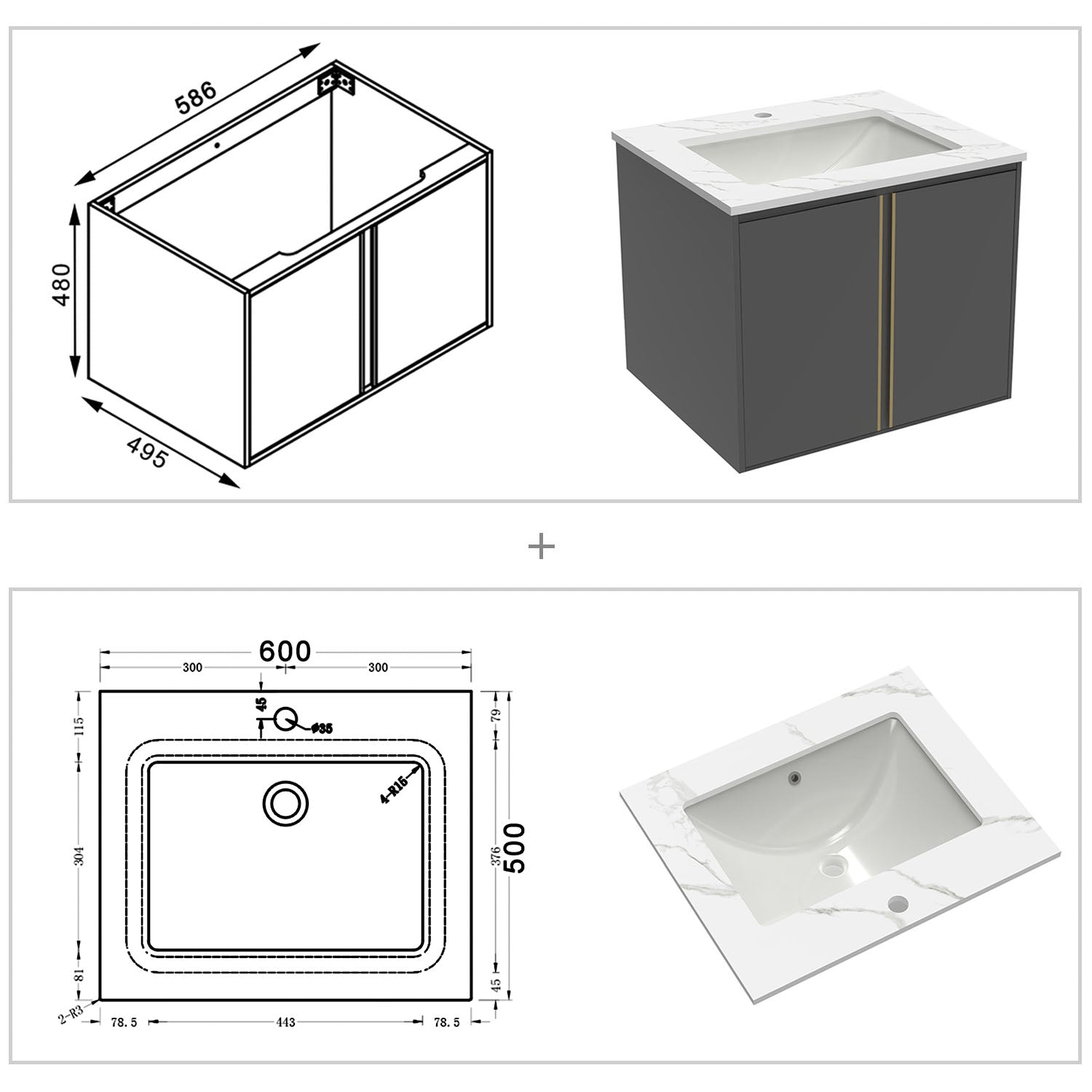 60 cm Waschbecken: 60 x 50 x 1.5 cm(Breite x Tiefe x Dicke)