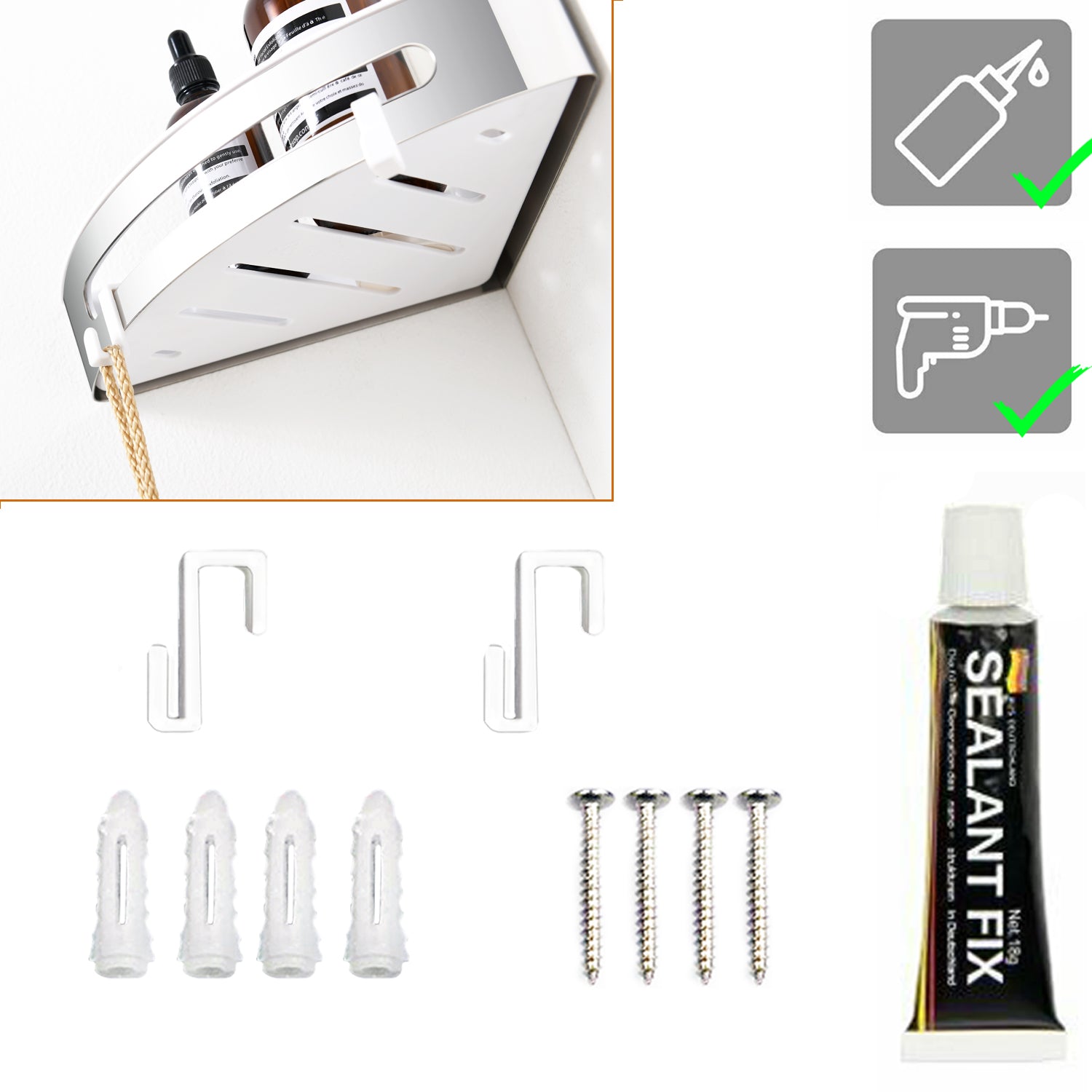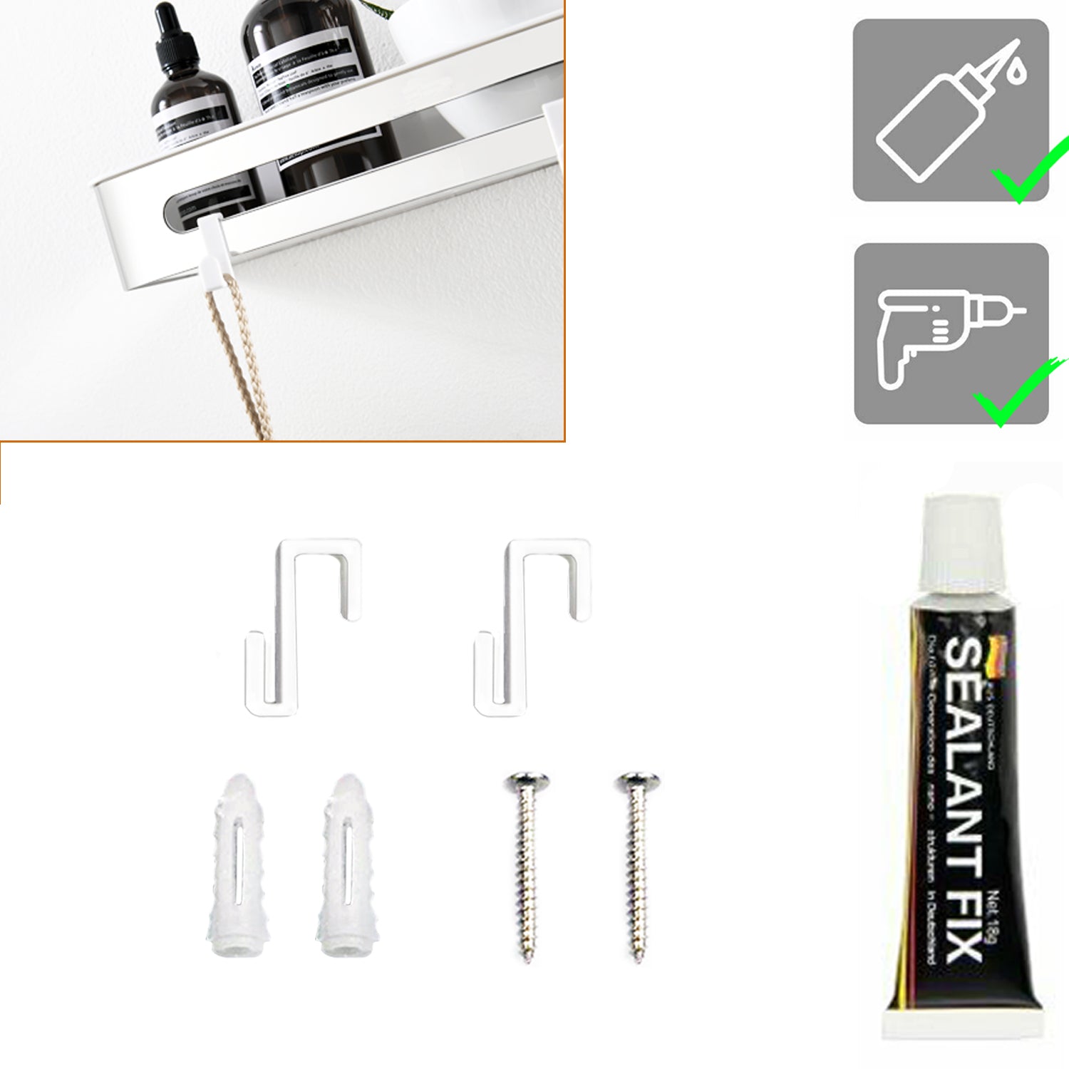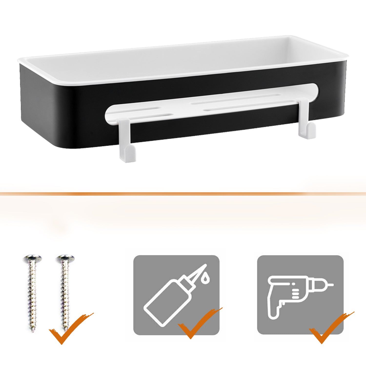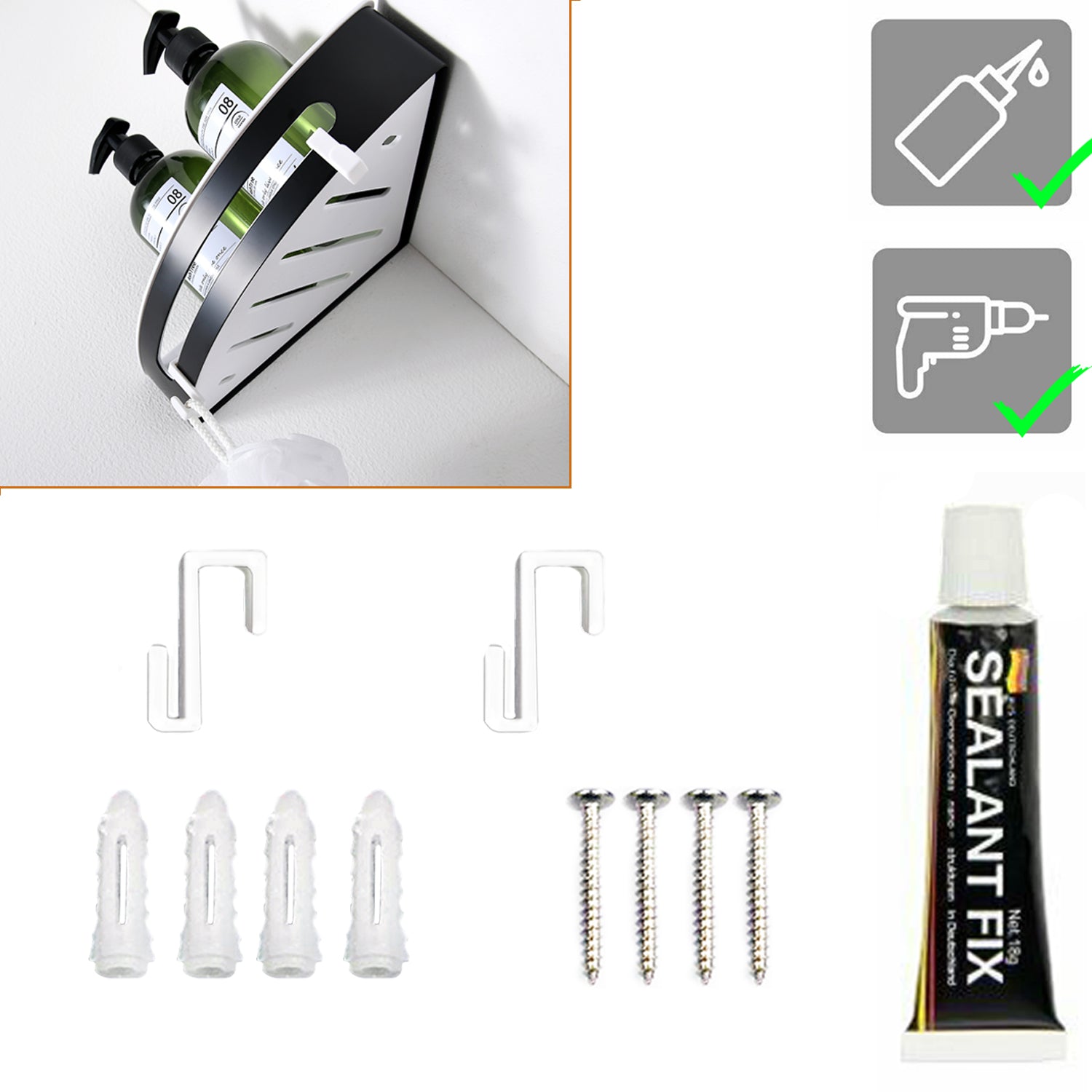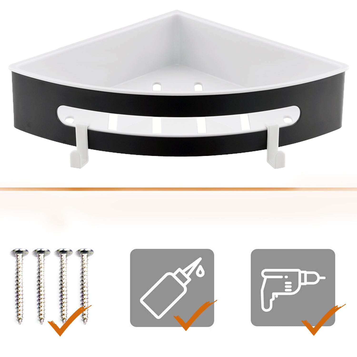 Duschablage mit 2 Haken, Duschkorb KLEBEN oder Bohren, Eckregal Rechteckig/Rechteckig, Schwarz