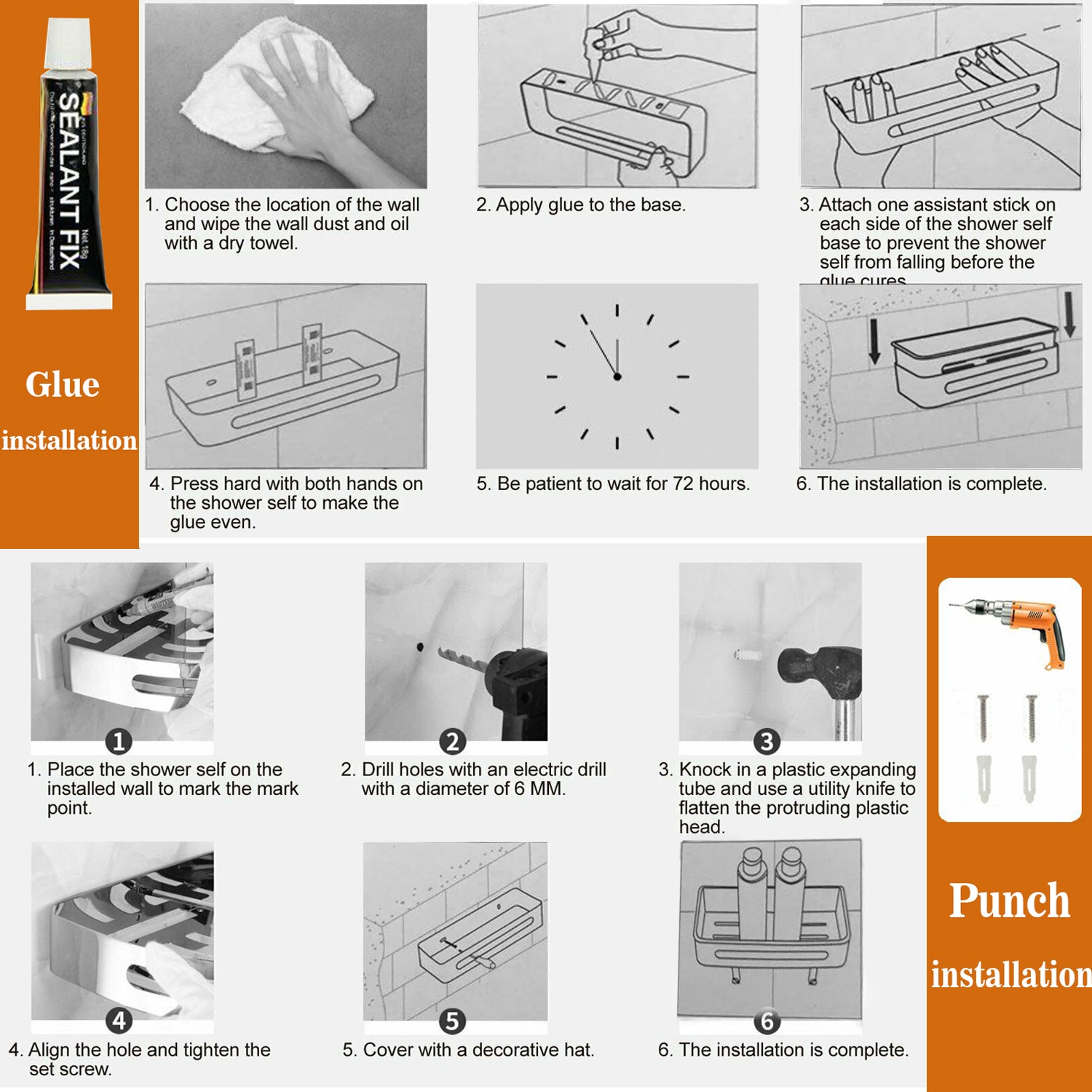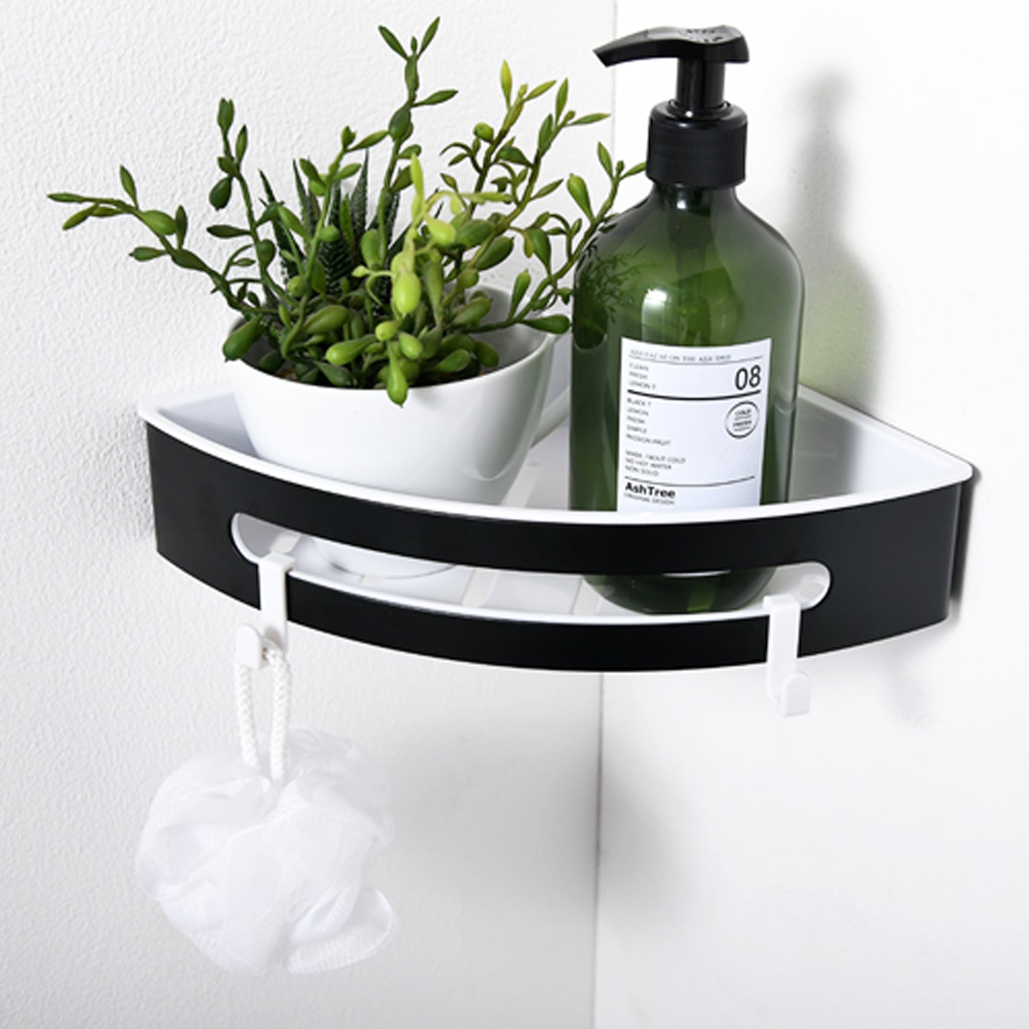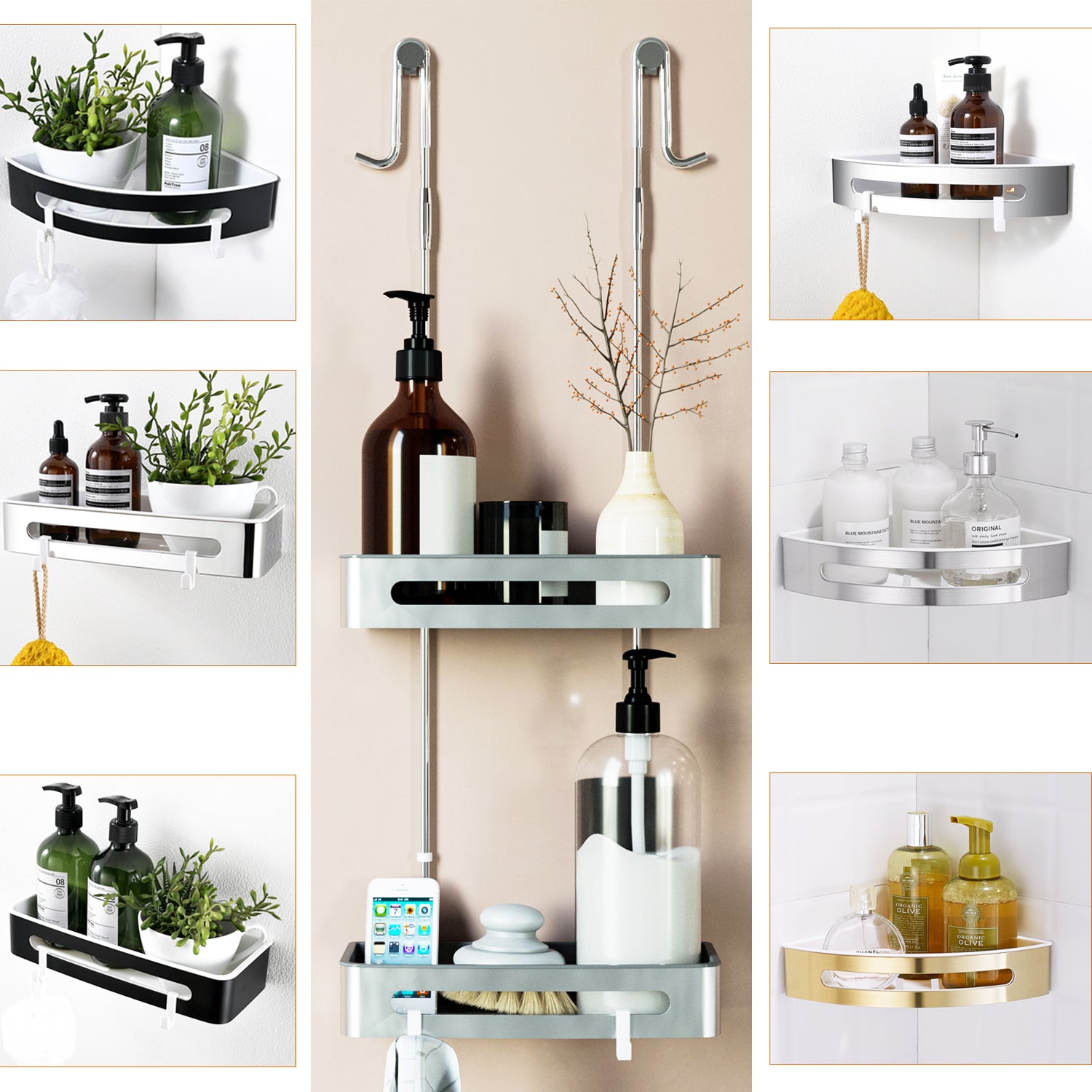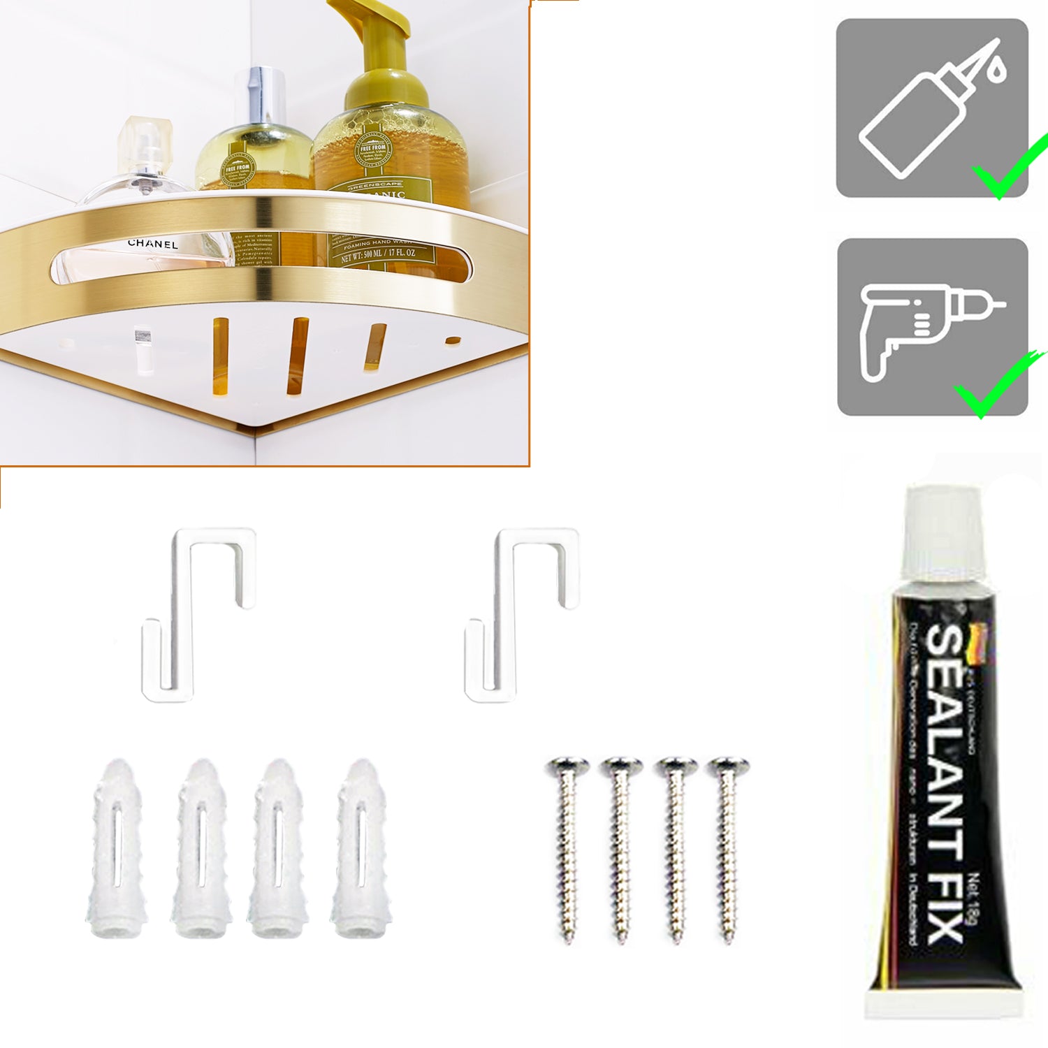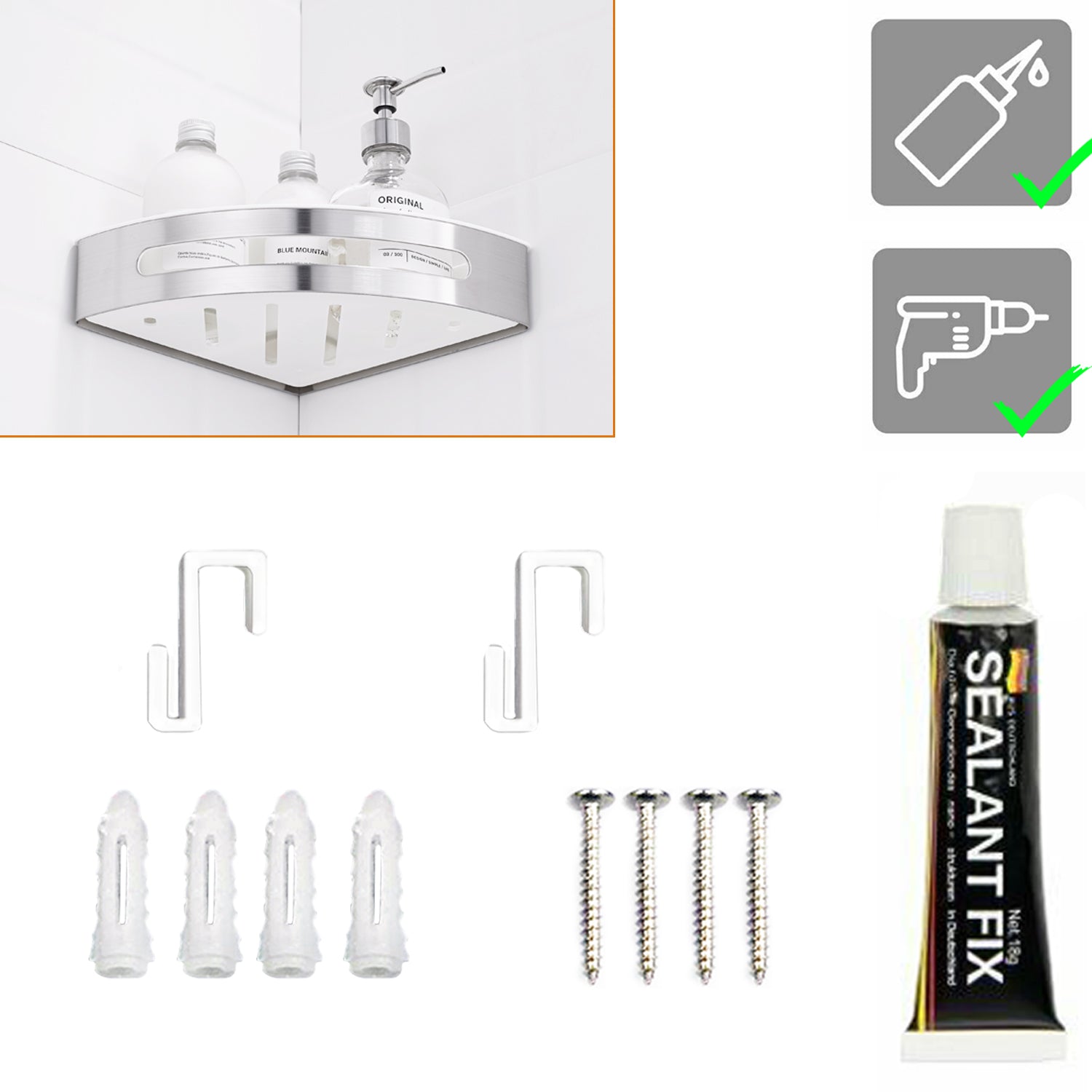 Duschablage mit 2 Haken, Duschkorb KLEBEN oder Bohren, Eckregal Rechteckig/Rechteckig, Schwarz