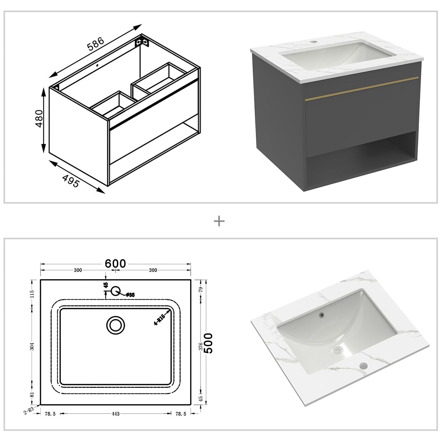 60 cm Waschbecken: 60 x 50 x 1.5 cm(Breite x Tiefe x Dicke)
