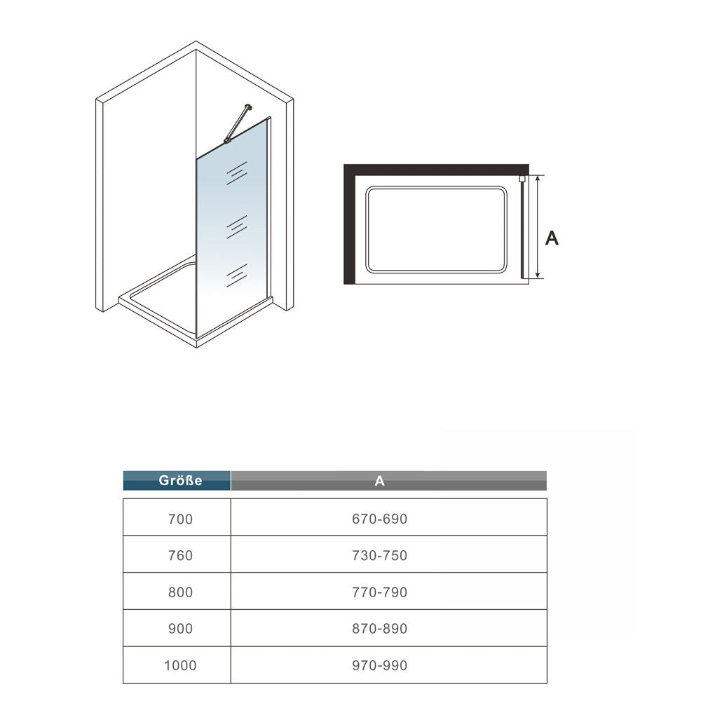 Achtung: Bei den Abmessungen handelt es sich immer um Außenmaße (inkl. Wandprofil, Glasscheibe und 20mm ins Minus Verstellbereich), bitte messen Sie nach, ob diese Duschabtrennung in den vorgesehenen Raum passt!