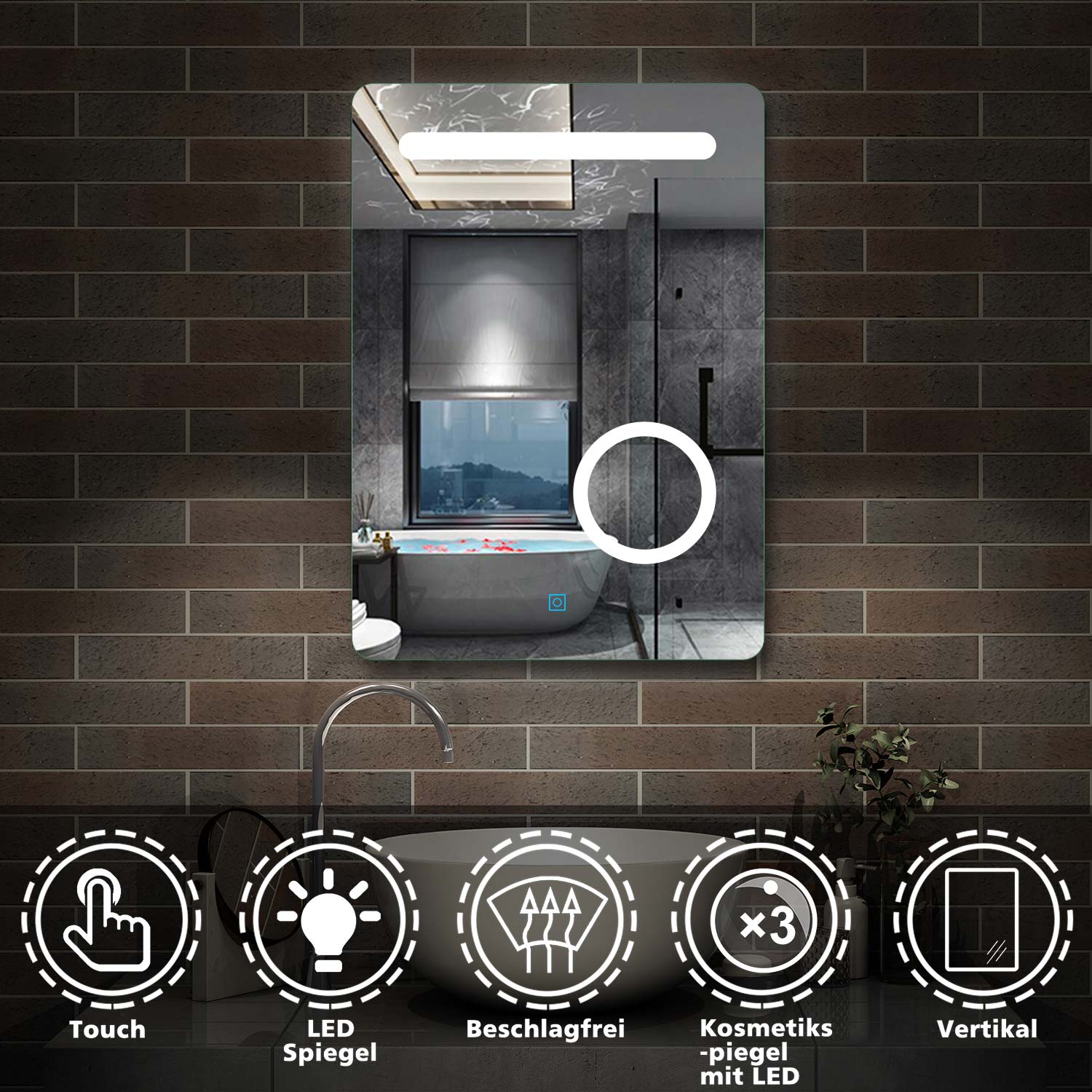 LED Badspiegel 50×70cm Wandspiegel mit Touch, Beschlagfrei,3-Fach Vergrößerung Schminkspiegel IP44 Kaltweiß energiesparend