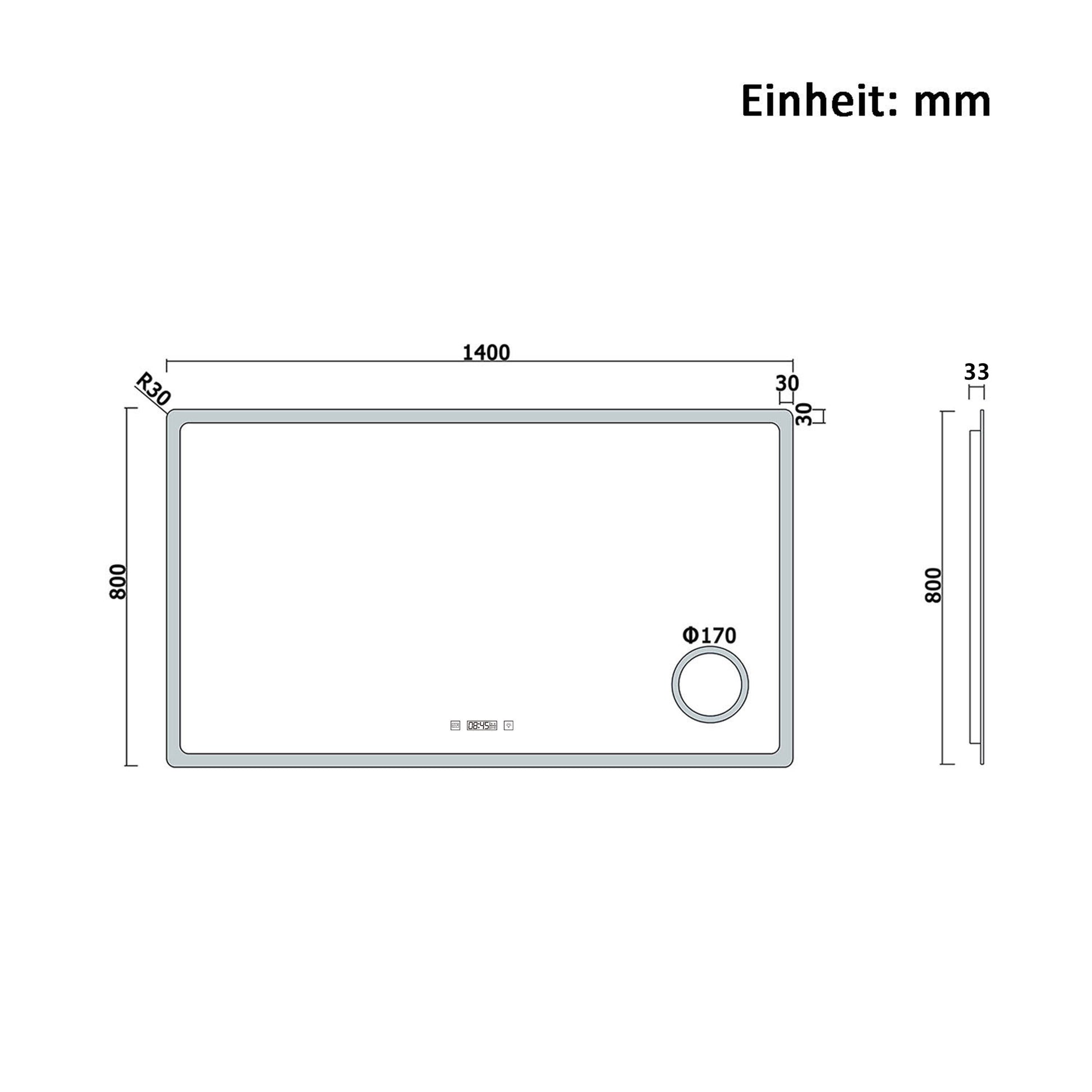 140x80cm LED Badspiegel mit Uhr,Touch und 3x Vergrößernder Kosmetikspiegel,Badspiegel mit Beleuchtung,Beschlagfrei,Badezimmerspiegel mit 3 Lichtfarbe 2700-6500K Dimmbar,IP44