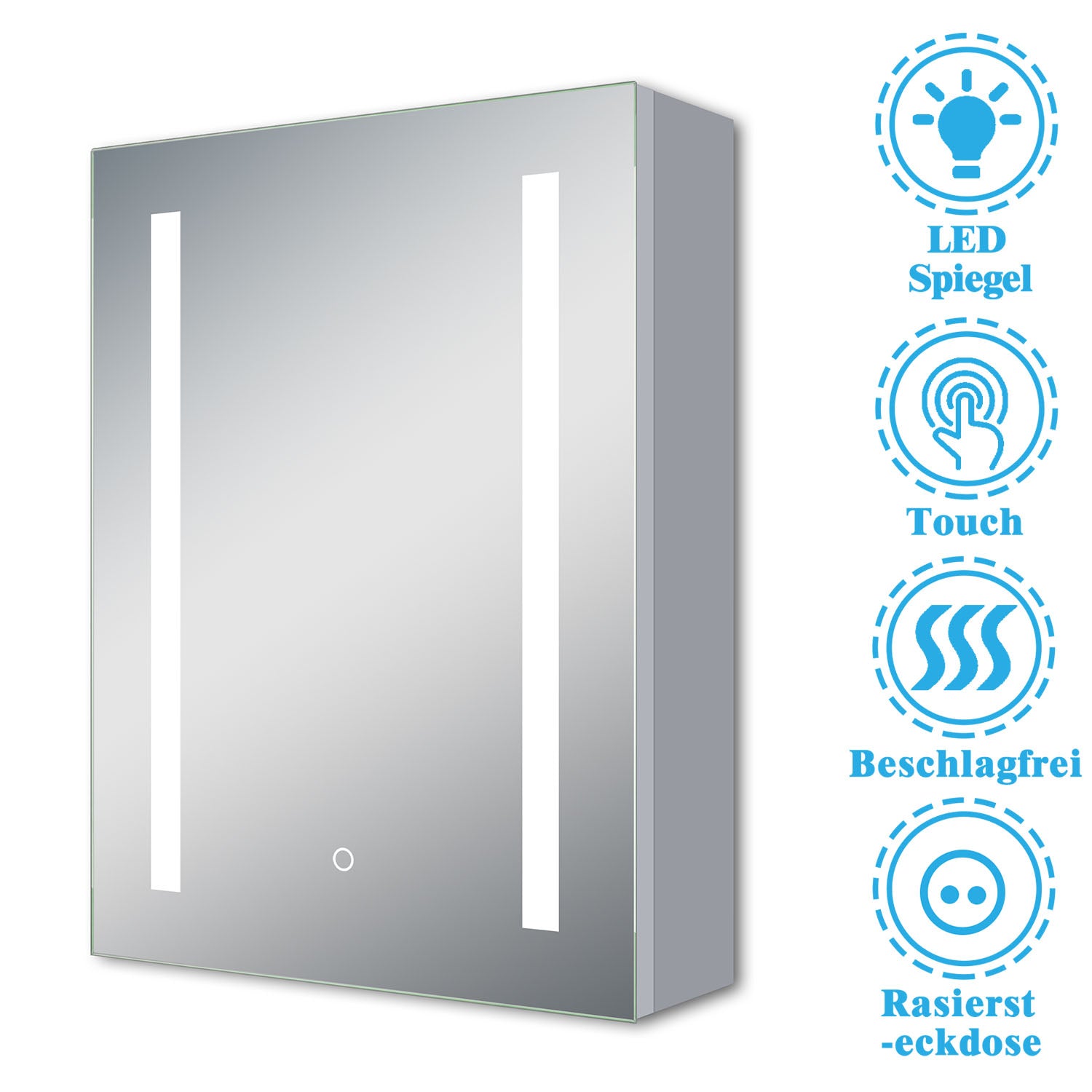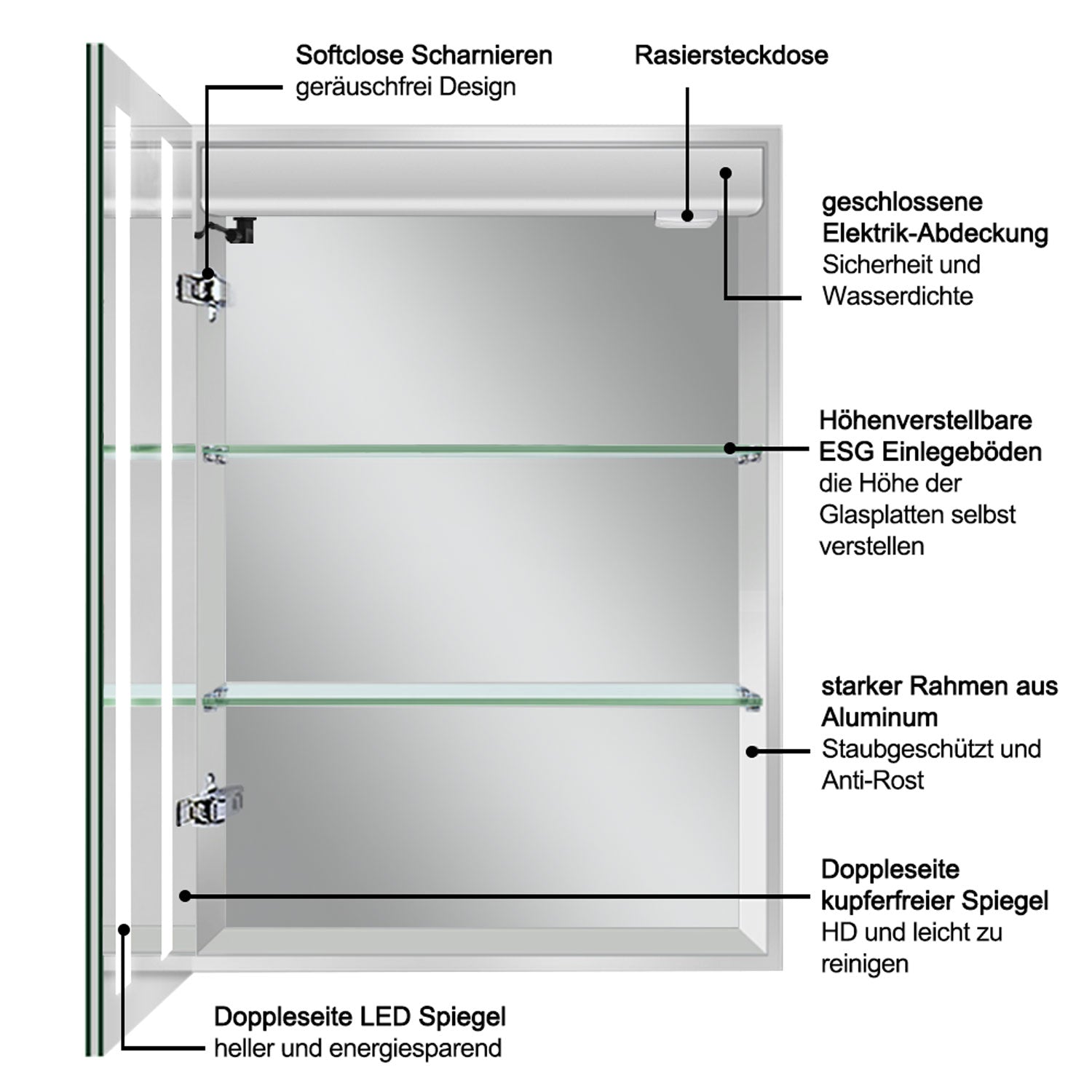 LED Spiegelschrank ARYA Badspiegelschrank mit Beleuchtung, Aluminium, beschlagfrei, Doppelseitiger Spiegel, Touch-Sensor Schalter, mit Steckdose, Kaltweiss
