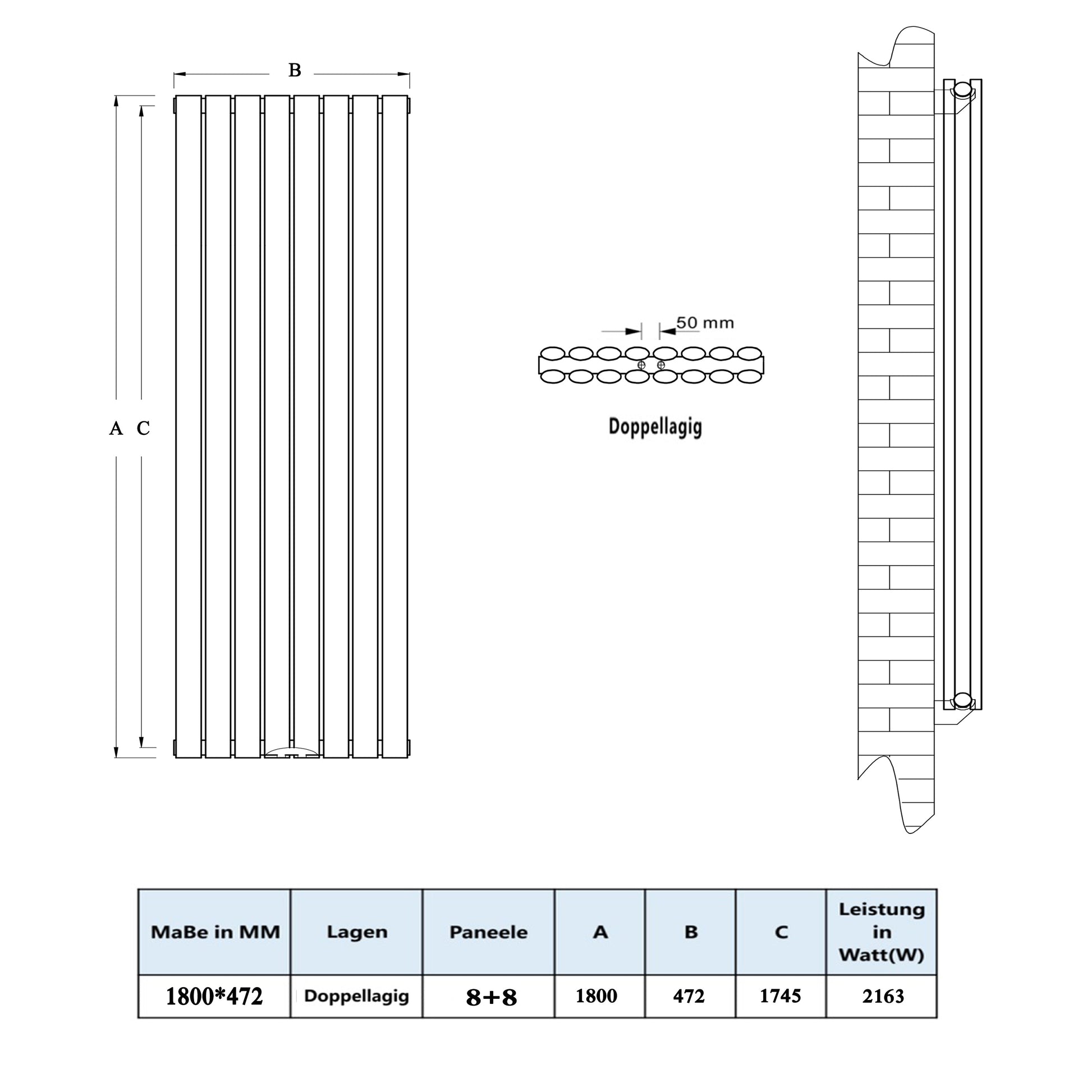 Aica Sanitär Design heizkörper oval 1800x472mm weiss Doppellagig